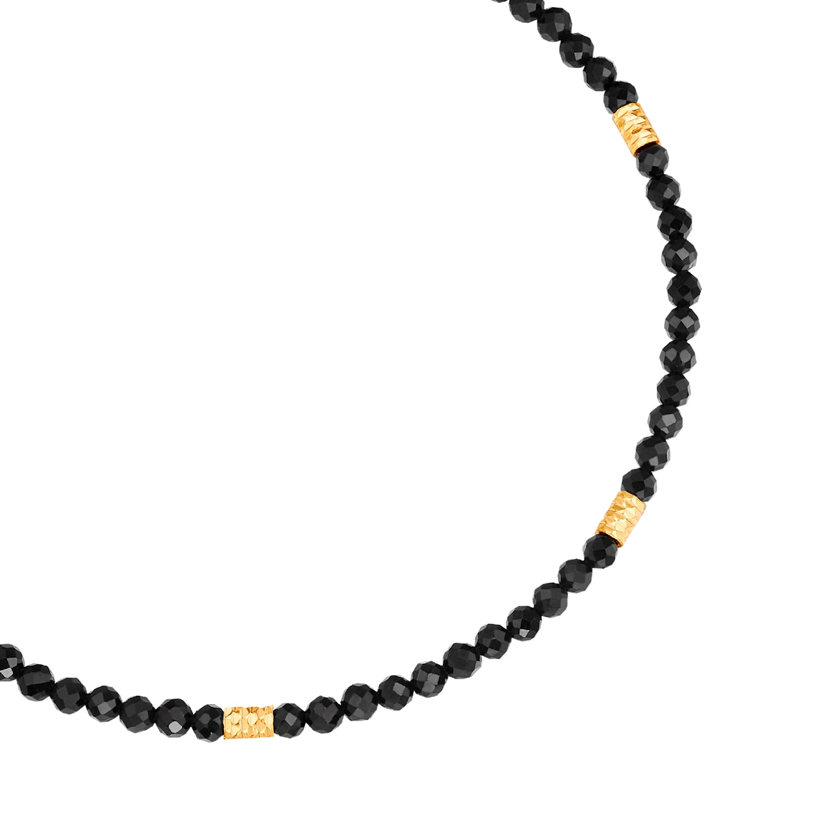Du hast ein Faible für zeitgemäßen Edelsteinschmuck und suchst ein kombinationsfreudiges Design? Dann ist dieses Armband eine gute Wahl. Ein Strang Naturstein-Perlen aus facettiertem Spinell schmiegt sich an dein Handgelenk und verzaubert mit dem intensiven Feuer des dunklen Edelsteins. Metallkugeln aus gelbvergoldetem Sterlingsilber setzen glanzvolle Akzente. Der Spinell verleiht jedem deiner Outfits eine Prise natürliche Schönheit - jeder Stein ist einzigartig. Dank Verlängerungskettchen mit Federringverschluss kannst du das Bracelet schnell und einfach in der Länge anpassen.