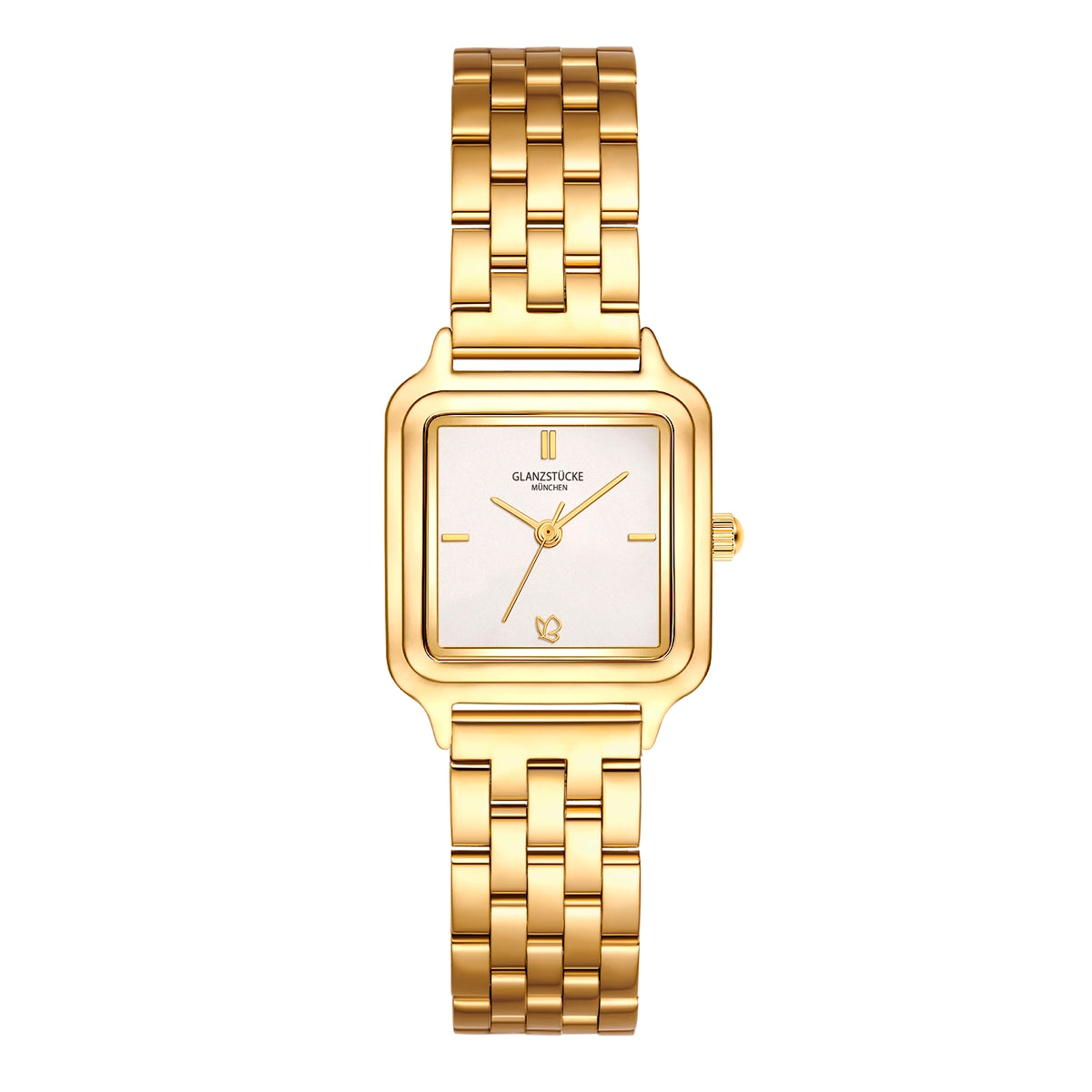 Diese Damenuhr ist ein wahres Schmuckstück für dein Handgelenk. Das gelbgoldene Gehäuse in quadratischer Form strahlt zeitlose Eleganz aus. Das mattierte, weiße Zifferblatt mit klaren Strichindizes sorgt für eine stilvolle und einfache Ablesbarkeit. Die Schwert-Zeiger gleiten präzise über das Zifferblatt, angetrieben von einem zuverlässigen Quarzwerk aus Japan. Das glatte Gliederarmband aus Edelstahl, ebenfalls in Gelbgold gehalten, lässt sich individuell kürzen und bietet dank der Sicherheits-Faltschließe einen sicheren Halt. Diese Uhr ist der perfekte Begleiter für jeden Anlass und verleiht deinem Outfit einen Hauch von Glamour.