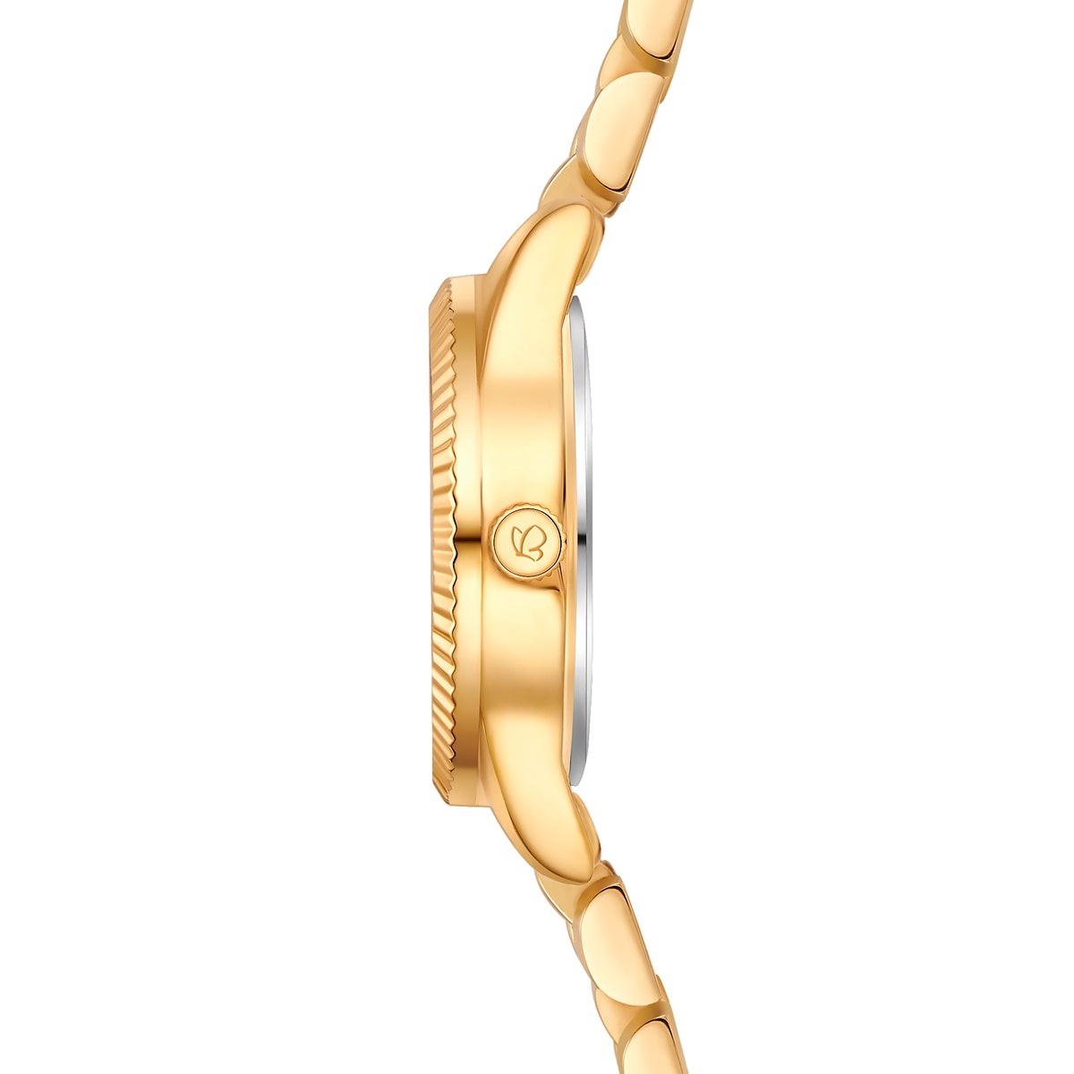 Diese Damenuhr ist der Inbegriff von zeitloser Eleganz und modernem Design. Das gelbgoldene, polierte Gehäuse mit seiner gerillten Lünette verleiht der Uhr einen luxuriösen Touch. Das mattierte, weiße Zifferblatt mit klaren Strichindizes bietet eine stilvolle und einfache Ablesbarkeit. Angetrieben von einem präzisen Quarzwerk aus Japan, garantiert diese Uhr Zuverlässigkeit und Langlebigkeit. Das glatte Gliederarmband aus Edelstahl, ebenfalls in Gelbgold gehalten, lässt sich individuell kürzen und schließt sicher mit einer Sicherheits-Faltschließe. Diese Uhr ist der perfekte Begleiter für jeden Anlass und verleiht deinem Outfit einen Hauch von Glamour.