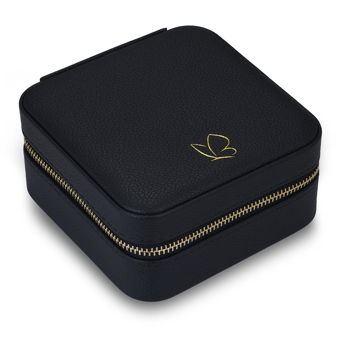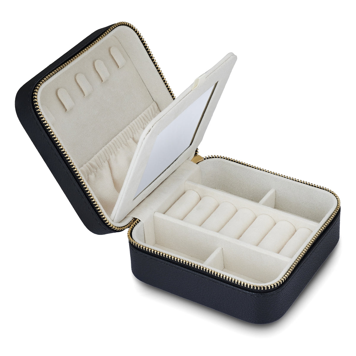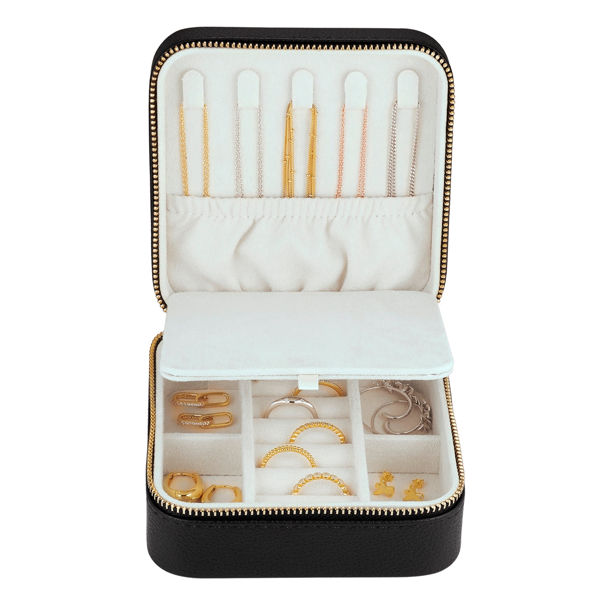 Entdecke das stilvolle Reisetäschchen, das nicht nur praktisch, sondern auch ein echter Hingucker ist. Das Täschchen aus hochwertigem Kunstleder in elegantem Schwarz bietet deinem Schmuck einen sicheren und stilvollen Aufbewahrungsort. Innen sorgt weicher Samt in Creme für optimalen Schutz deiner Lieblingsstücke. Der goldene Reißverschluss verleiht dem Täschchen einen Hauch von Luxus und Eleganz. Ein integrierter Spiegel ermöglicht dir, jederzeit deinen Look zu überprüfen. Dieses Reisetäschchen ist das perfekte Geschenk für jemanden, der viel unterwegs ist und dabei nicht auf Stil verzichten möchte. Ob für dich selbst oder als Geschenk, es wird garantiert Freude bereiten. Lass dich von der Qualität und dem Design begeistern!