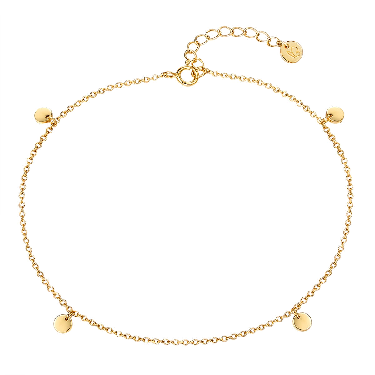 Sobald es draußen warm wird, willst du deine Beine besonders betonen? Dann ist dieses hübsche Fußkettchen ein echter Eyecatcher, der deine Knöchel toll umschmeichelt. Das Ankerkettchen mit vier Mini-Medaillons ist aus 925er Sterlingsilber gefertigt und erstrahlt dank der warmen Gelbvergoldung in einer klassischen Edelmetallnuance, die nie unmodern wird. Dank eines Verlängerungsstücks mit Federringverschluss punktet das Fußkettchen mit hohem Tragekomfort und lässt sich einfach an dein Fußgelenk anpassen. Ob Rock, Kleid oder Shorts, zu hohen Sandaletten, sportlichen Sneakers oder flachen Espadrilles: Das kombinierfreudige Schmuckstück passt immer und verleiht deinem Sommer-Outfit einen Hauch Boho-Feeling.