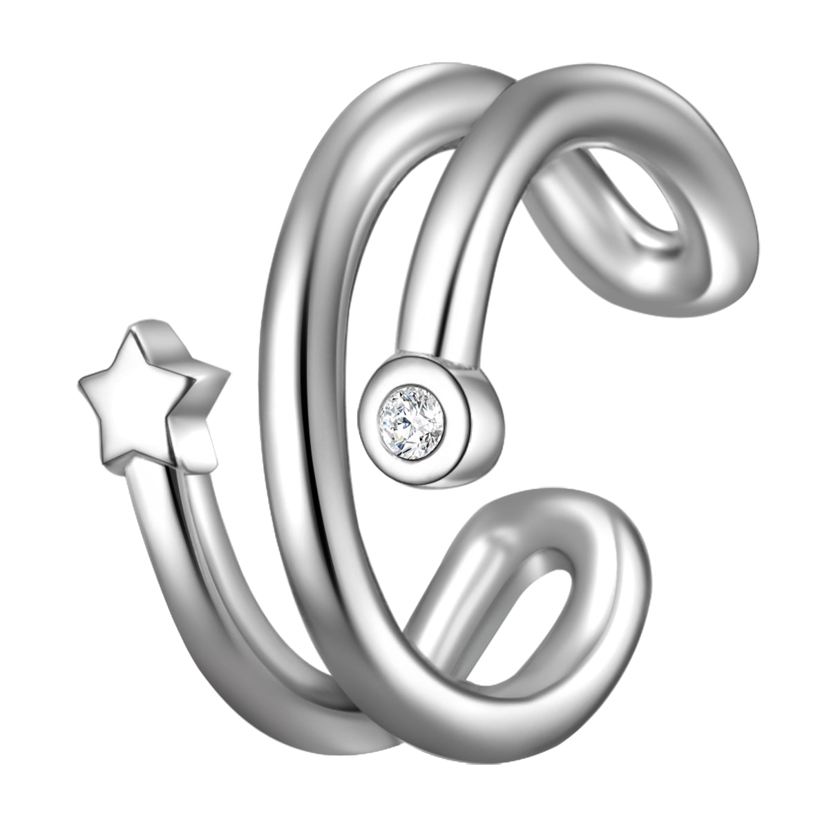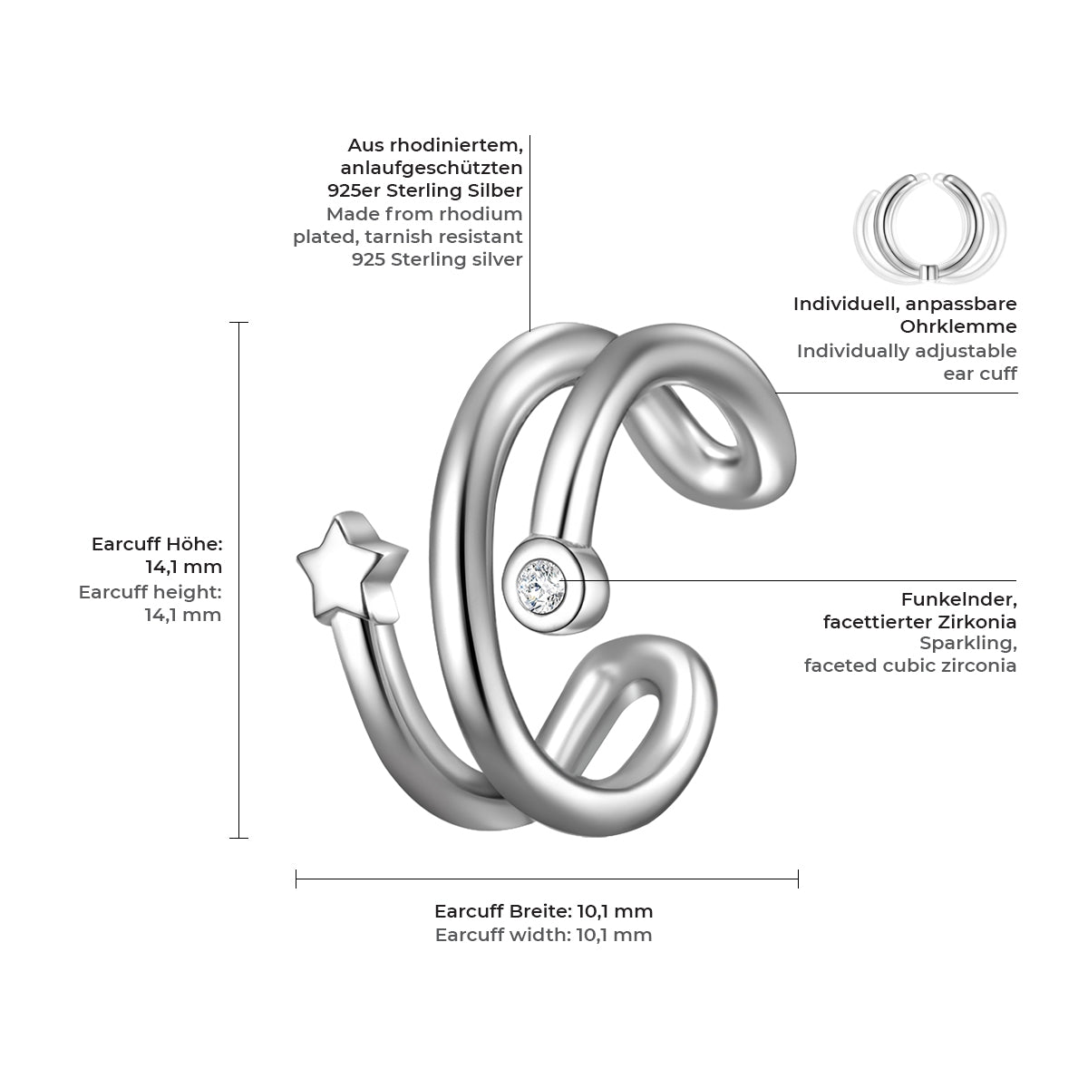 Ohrklemmen - auch Earcuffs genannt - sind ein Trend aus den USA und die It-Pieces der Saison für jede modebewusste Fashionista. Mit diesem filigran gestalteten Modell wird Ohrschmuck flexibler denn je, denn du brauchst dir keine zusätzlichen Ohrlöcher stechen zu lassen. Du klemmst den Earcuff einfach an die gewünschte Stelle der Ohrmuschel, ganz ohne Stecker oder Verschluss. Das elegant gewundene Silberband ist aus rhodiniertem Sterlingsilber gefertigt und an den beiden Enden mit einem kleinen Sternchen und einem glitzernden Zirkonia verziert. Auf die Ohrläppchen, fertig, los!